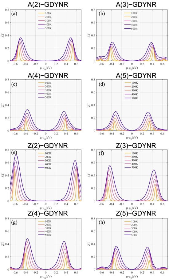 Temperature-dependent ZT as a function of chemical potential for (a) γ-A(2)GDYNRs, (b) γ-A(3)GDYNRs, (c) γ-A(4)GDYNRs, (d) γ-A(5)GDYNRs, (e) γ-Z(2)GDYNRs, (f) γ-Z(3)GDYNRs, (g) γ-Z(4)GDYNRs, (h) γ-Z(5)GDYNRs.