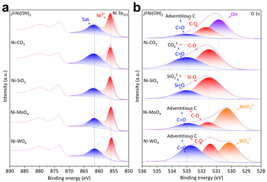 (a) Ni 2p XPS and (b) O 1s XPS of β-Ni(OH)2, Ni-CO3, Ni-SiO3, Ni-MoO4, and Ni-WO4.