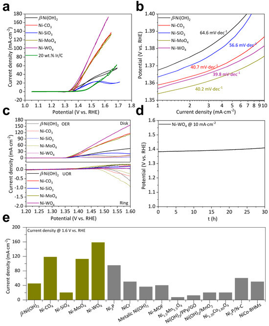 (a) UOR CV curves, (b) UOR Tafel slopes, and (c) OER and UOR RRDE polarization curves of β-Ni(OH)2, Ni-CO3, Ni-SiO3, Ni-MoO4, and Ni-WO4. (d) UOR durability of Ni-WO4. (e) Comparison of UOR performance of catalysts decorated on glassy carbon electrode.
