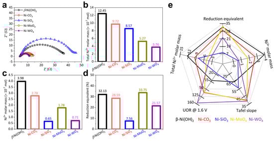 (a) UOR EIS, (b) total Ni2+ molar mass, (c) Ni3+ molar mass transformed from Ni2+, (d) reduction equivalent, and (e) summary of UOR performance of β-Ni(OH)2, Ni-CO3, Ni-SiO3, Ni-MoO4, and Ni-WO4.