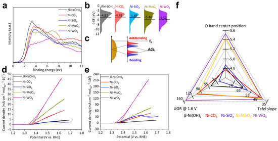 (a) Valence band spectra, (b) d band models derived from valence band spectra, (c) bond formation scheme, (d) UOR CV curves normalized by the total Ni2+ molar mass, (e) UOR CV curves normalized by Ni3+ molar mass, and (f) summary of UOR performance of β-Ni(OH)2, Ni-CO3, Ni-SiO3, Ni-MoO4, and Ni-WO4.