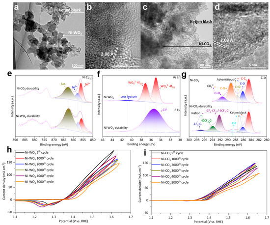 To verify if the true active sites are Ni3+ moieties for Ni-WO4 and Ni-CO3, TEM and XPS were adopted to examine Ni-WO4 durability and Ni-CO3 durability. Catalyst nanoparticles and Ketjen black are observed in TEM images of Ni-WO4 durability and Ni-CO3 durability (Figure 6a,c). HRTEM images of Ni-WO4 durability and Ni-CO3 durability both demonstrate a facet with a width of 2.08 Å ascribed to the (200) facet of nickel (oxy)hydroxide (Figure 6b,d) [22,35]. Ni 2p3/2 XPS of Ni-WO4 durability and Ni-CO3 durability are fitted with Ni2+ (856.10 eV) and Ni3+ (857.80 eV), followed by a satellite (862.70 eV) [36], confirming the formation of Ni3+ moieties. W 4f XPS of Ni-WO4 possesses three peaks of 4f7/2 (34.98 eV), 4f5/2 (37.16 eV), and tungsten oxide loss feature (40.81 eV) (Figure 6f) [53,54]. W signal cannot be detected in the corresponding binding energy range for Ni-WO4 durability, suggesting that element W on the Ni-WO4 surface was completely dissolved during UOR catalysis. F 1s XPS of Ni-WO4 durability demonstrates one peak of C-F moieties located at 35.39 eV which results from the Nafion molecules (Figure 6f) [55]. C-C (284.60 eV), C-O (286.14 eV), C=O (287.60 eV), C-O (289.29), and C=O (291.46) are detected in C 1s XPS of Ni-CO3 (Figure 6g) [55,56]. C-C (284.60 eV), C-O (286.14 eV), C=O (287.60 eV), C-F (288.77 eV), -CF2-CF2-/-SCF2-C- (292.19 eV), -OCF2-C- (293.88 eV), and -CF3-C- (296.89 eV) are detected in C 1s XPS of Ni-CO3 durability (Figure 6g) [55]. The comparison of C 1s and W 4f fitting results of Ni-CO3 and Ni-WO4 before and after UOR durability tests (Table S1). The signal of nickel carbonate structure in C 1s XPS spectrum of Ni-CO3 durability disappeared, indicating the complete dissolution of nickel carbonate on Ni-CO3 surface during UOR catalysis. The UOR activity of both Ni-WO4 and Ni-CO3 just slightly fluctuates during the continuous 5000 cycles (Figure 6h,i). Therefore, we can infer that the WO42− and CO32− do not directly participate in the UOR catalysis and true active sites are Ni3+ moieties. The higher UOR activity of Ni-WO4 than Ni-CO3 for all the 5000 cycles indicates that the pre-catalysts are not the true active sites but determine the final UOR activity.