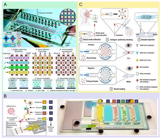 Microfluidic technology enhances the capability for low cost and high-throughput analysis. Currently, microfluidic technologies have paved the way for testing for pathogenic microorganisms, attributed to their fast, economical, and sensitive detection characteristics. Rodriguez-Moncayo et al. have developed a high-throughput device that can evaluate the presence of four distinct SARS-CoV-2 antibodies in as many as 50 serum samples concurrently. The microfluidic system, comprising 200 microchambers, with each chamber holding a volume of 5.5 nanoliters, is controlled via valves equipped with a central button. This design allows for the automated loading of reagents through valve operation and computerization. The sensitivity of this assay is 95%, with a specificity of 91% and a detection limit of 1.6 ng/mL [11] (Figure 1A). Swank et al. explain that it is important to guide public health decisions to establish the true spread of the COVID-19 virus and know how many people have been exposed (including those who only had a mild disease or no symptoms at all). They define a microfluidic immunoassay that can be run in parallel on up to 1024 samples. The testing methodology integrates blood test strips with two proprietary devices, achieving a specificity and sensitivity of 100% and 98%, respectively, with a detection limit of 1 nM, across a pool of 289 human samples. The blood test strips require only a simple finger prick to easily obtain 0.6 mL of whole blood. The microfluidic system uses a standard dual-layer PDMS structure, consisting of a flow and a control layer. The precise management of fluids is executed by manipulating pneumatic valves within the control layer. This technology achieves cost-effective sampling of minute blood through microfluidic nanoscale immunoassays, which are capable of detecting up to 1024 samples per device. These innovative technologies are required to enable the large-scale detection of antibodies specific to the virus. Additionally, these advancements are crucial for monitoring the quality and duration of immune responses [12]. In tackling the task of developing an assay that is both user-friendly and readily deployable for detecting past exposure to and immune reaction against SARS-CoV-2, Heggestad et al. devised a detection method that uses inkjet printing technology to produce stable, spatially discrete capture points for antibody assay reagents, which can evaluate antibody levels in plasma samples from 31 severe COVID-19 patients—41 in good health and 18 infected with the coronavirus. This method is highly sensitive and specific, enabling the tracking of antibody conversion and showing good concordance with live virus neutralization assay results. A completely independent immunoassay platform with minimal user intervention was performed, which greatly simplified the detector design and reading processes. The sensitivity and specificity of this assay both achieved 100% and a detection limit of 0.12 ng/mL [13]. To operate independently from external attachments, devoid of additional components, embed algorithms directly into their structure, and have the potential to become an economical, adaptable, authentic lab-on-a-chip solution applicable across various tasks, including fluid manipulation and on-the-spot medical testing, Yafia et al. [52] proposed the concept of microfluidic chain reaction (MCR). MCR relies on the conditional and structural programming propagation of capillary flow events, achieving precise control over complex processes. This technology was used in the automated detection of SARS-CoV-2 without requiring any external intervention to switch fluids. With parallel operation, timers, synchronous flow cycles, and flow cessation operations, they achieved continuous sampling and analysis of activated clotting plasma and automated detection in saliva. This microfluidic system uses paper as a capillary pump; consequently, there is no need for any complicated actuation system. MCR invented by Yafia at al. [52] is not used by anyone else. The interest of this microfluidic system is demonstrated by performing all the steps of a standard ELISA protocol, and can also be used to perform other bioassays that require sequential fluid manipulation [52] (Figure 1B).