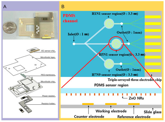 - Han, J.H.; Lee, D.; Chew, C.H.C.; Kim, T.; Pak, J.J. A multi-virus detectable microfluidic electrochemical immunosensor for simultaneous detection of H1N1, H5N1, and H7N9 virus using ZnO nanorods for sensitivity enhancement. Sens. Actuators B Chem. 2016, 228, 36–42. [Google Scholar] [CrossRef]