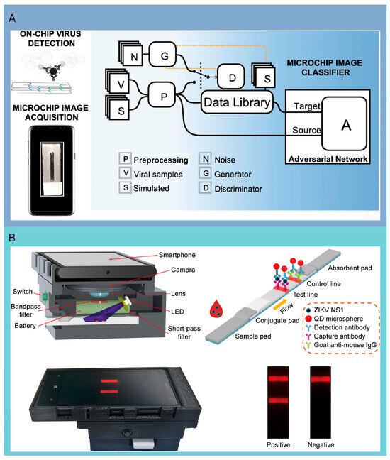 Smartphones can process and analyze data in real time, providing immediate results and enabling timely medical interventions and decision-making, which are widely available and user-friendly, making them ideal for integrating with microfluidic chips to create accessible diagnostic tools for a broader population. The combination of image processing technology using deep learning (DL) with smartphones has been applied to the detection of novel coronavirus antigens. Shokr et al. developed a virus diagnostic platform using conditional generative adversarial networks that are easy to reconstruct. This method can rapidly produce image classifiers for various pathogens by examining data from microfluidic chip imagery captured via smartphones. Verification trials using this platform on 179 patient samples, targeting five distinct antigens, have validated its versatility. Impressively, it has proven a 100% success rate in the detection of SARS-CoV-2 antigens from 62 nasal swab specimens [25] (Figure 6A). Moreover, recognizing the potential for SARS-CoV-2 transmission via bioaerosols, Kim and colleagues have designed a portable, cost-effective, paper-based microfluidic detection system that interfaces with smartphones. This device is adept at directly detecting the virus in airborne droplets or aerosols, eliminating the need for air sampling or extensive sample collection, with the total detection process taking under 30 min. The versatility of these microfluidic devices not only provides convenience for detecting SARS-CoV-2 but also paves the way for other pathogens analyses [88]. Further advancing the field, Rong’s group created a paper-based microfluidic platform integrating quantum dot probes with smartphone interfaces for output reading. This system stands out for its minimal cross-reactivity with other viruses, and it can precisely detect ZIKV in serum samples in just 20 min, with an impressive detection threshold of 0.15 ng/mL [35] (Figure 6B). Smartphones offer robust connectivity options, allowing for seamless data sharing and remote monitoring by healthcare professionals, enhancing patient care and follow-up. While the integration of smartphones with microfluidic chips is still developing, there are already some commercial products and research prototypes available, showing the potential for significant market growth and innovation in the near future.
