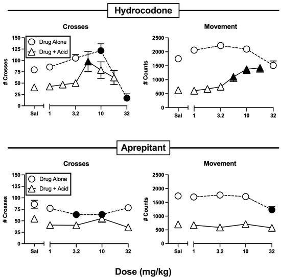 | Aprepitant | Alone | F(4,55) = 2.77, p = 0.0359-F | F(4,55) = 8.16, p < 0.0001 |
