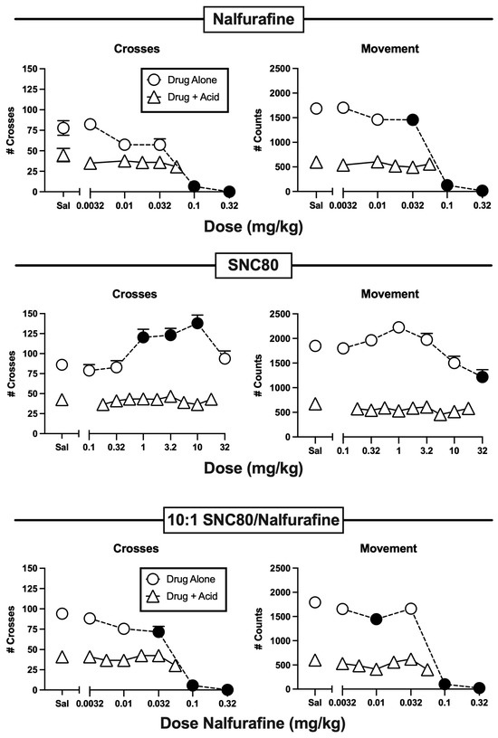 3.2. Effects of Nalfurafine and SNC80 Administered Alone or in Combination