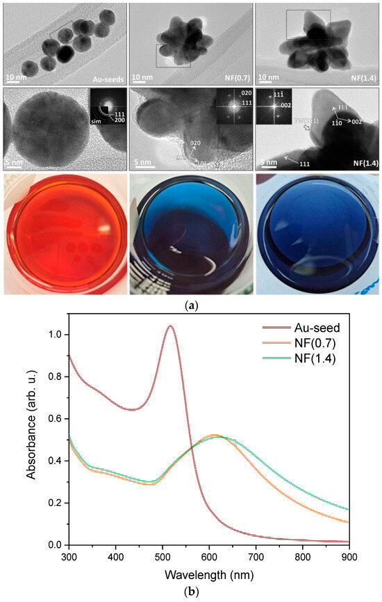 The UV-Vis absorption spectra were first measured for the gold seed solution and the suspension of Au NFs. The measured spectra (Figure 1b) show that the shape of the spectrum depends on the size and shape of the gold nanoparticles. The UV-Vis spectra of NF(0.7) and NF(1.4) suspensions look very similar; minor deviations between the curves probably occur due to a change in the size and shape of the gold nanoparticles between the two samples.