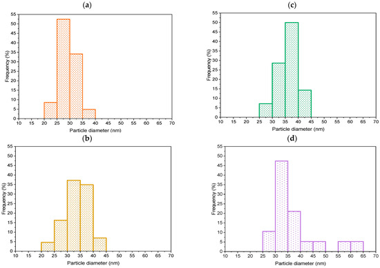 The particle size distribution diagrams of Au particles on the surface of (a) TNR + NF(0.7), (b) TNR + NF(0.7, heated), (c) TNR + NF(1.4), and (d) TNR + NF(1.4, heated) samples.