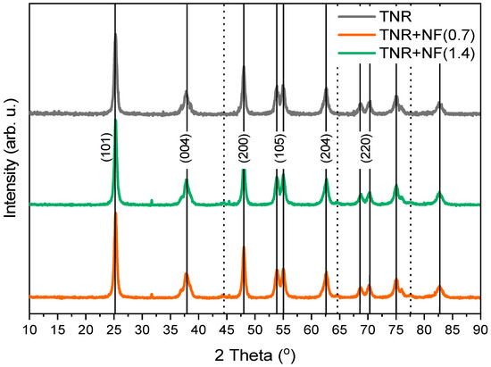 Based on the position of the peaks in the XRD diffractograms, we can conclude that TiO2 is present only in the anatase form (Figure 4). Since the Scherrer equation is used to calculate the crystallite size of spherical particles (by calculating the volume of the individual crystallite) and TiO2 is in the form of nanorods, we can only calculate the apparent size of TiO2 crystallites using the XRD technique. The results of the calculations are listed in Table 3. The average apparent size of TiO2 crystallites is 17 nm in TNR and Au/TiO2 samples calculated from the anatase TiO2(101) diffraction peak at 25°. The apparent size of the anatase crystallites was also the same for the Au/TiO2 catalysts, indicating that the TNR support was not affected by the Au deposition process. In the TNR + NF(0.7) and TNR + NF(1.4) samples, the peak at 32° appears, which is not visible in the TNR sample. The peak at 32° is characteristic of the compound Na2O (from Na-citrate) [58].