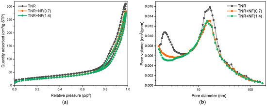 (a) Nitrogen adsorption/desorption isotherms of the TNR support, and TNR + NF(0.7) and TNR + NF(1.4) catalysts; (b) corresponding BJH pore size distribution.