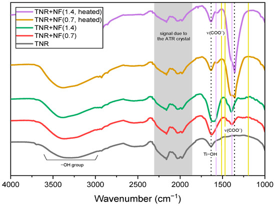The ATR-FTIR spectra of the synthesized Au/TiO2 catalysts are shown in Figure 6. In addition, the ATR-FTIR spectra of pure Na-citrate and HQ used for the preparation of Au NFs and the ATR-FTIR spectra of the TNR support with adsorbed Na-citrate and/or HQ (without Au) are shown in Figure S6. HQ (Figure S6a) shows some prominent peaks at wavenumbers 1511 and 1465 cm−1 (belonging to the C-C vibrational bands of the aromatic ring), at 1350 cm−1 (associated with the O-H bending) and at 1192 cm−1 (attributed to the in-plane C-H bending) [60]. The HQ molecule could be bound to the surface of the TNR support perpendicularly via one of the OH groups or planarly via the benzene ring. As can be seen in Figure S6b, the latter binding does not allow many vibrations, so that the peaks are of very low intensity. Pure Na-citrate shows main vibrations at 1576 and 1386 cm−1 (Figure S6a), which belong to the asymmetric and symmetric stretching of the carboxyl groups, respectively [61,62]. After the adsorption of Na-citrate on the surface of TNR, there was no shift in the peaks (Figure S6b). The same applies to heating this material to 300 °C. In this case, only the intensity of the peaks decreased, which is due to the partial removal of Na-citrate from the TNR surface. When both Na-citrate and HQ were adsorbed on the TNR surface, the most frequent peaks belonged to Na-citrate. When both species are adsorbed, it is obvious that the extent of HQ adsorption on the TNR surface increases over one of the OH groups (the appearance of a broad peak at 1240 cm−1). From the recorded ATR-FTIR spectra of the Au/TiO2 samples (Figure 6), the most abundant peaks belong to the adsorbed Na-citrate. However, the peaks at 1576 and 1395 cm−1 are shifted to 1638 and 1356 cm−1, respectively, which we attribute to interactions of the Au NPs with the carboxyl groups in the adsorbed Na-citrate. This was confirmed by XPS analysis (see below) and is in agreement with literature reports [63]. The decrease in the intensity of the peaks at 1638 cm−1 and the increase in the intensity of the peaks at 1356 cm−1 upon heating the Au/TiO2 samples to 300 °C can be attributed to (i) the partial removal of the adsorbed organic compounds on the catalyst surface (Table 2) and (ii) the simultaneous rearrangement of the surface-bound C-containing species.