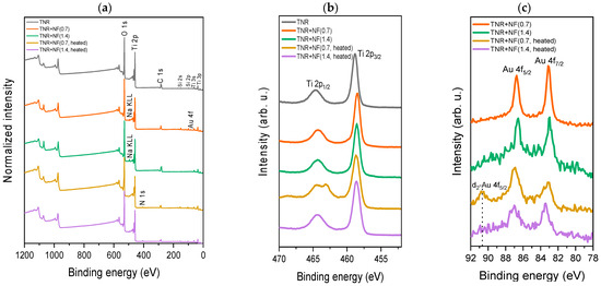 (a) Survey spectra and (b) high-resolution Ti 2p spectra for TNR, TNR + NF(0.7), TNR + NF(1.4), TNR + NF(0.7, heated) and TNR + NF(1.4, heated) samples. (c) High-resolution Au 4f spectra for TNR + NF(0.7), TNR + NF(1.4), TNR + NF(0.7, heated) and TNR + NF(1.4, heated) samples.