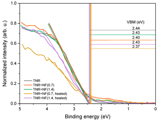 where represents the work function of Au and represents the electron affinity of the TNR catalyst support. Figure 8 shows valence band maxima (VBM) curves, and the calculated SBH values are listed in Table 1. The value of the SBH in the investigated Au/TiO2 catalysts corresponds to the differences between the VBM of pure TNR and the VBM of the Au/TiO2 catalysts and is in the range of 0.01–0.07 eV, which is consistent with reports in the literature where the SBH values are well below 1.0 eV [28,70,71]. TNR + NF(0.7, heated) and TNR + NF(1.4, heated) samples exhibit higher SBH than samples before heating.