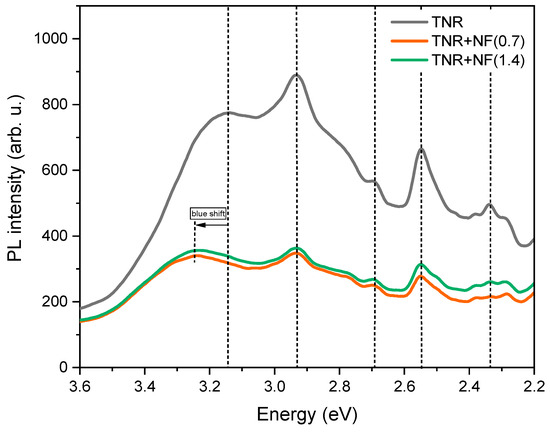 In the case of the TNR + NF(0.7) sample, there was a reduction in NO2 observed as soon as the light source was switched on (Figure 12a). The initial increase in NO2 conversion could be due to the formation of active species from –OH groups and surface-adsorbed water. However, over time, these are depleted, and we can observe a steady-state NO2 turnover after 15 min of visible-light exposure (Figure 12a) [85,86]. Furthermore, this spike becomes smaller with each cycle as fewer “fresh” –OH groups and water molecules are available on the surface of the sample. The activity of the TNR + NF(0.7) sample is expected as the Au NPs exhibit the LSPR effect (UV-Vis DR measurements), and the sample contains Ti3+ (XPS and EPR measurements), which can utilize visible light. In contrast, the TNR + NF(1.4) sample showed no ability to reduce NO2 under visible light (Figure 12b), which is quite surprising. None of the expected products were detected, which means that the inhibitory effect must occur in the early stages of the photocatalytic mechanism (adsorption of NO2, activation of NO2, etc.). To understand this phenomenon and provide possible explanations, we need to consider the results of UV-Vis DR, PL and EPR measurements. This could explain the non-activity of the TNR + NF(1.4) sample: