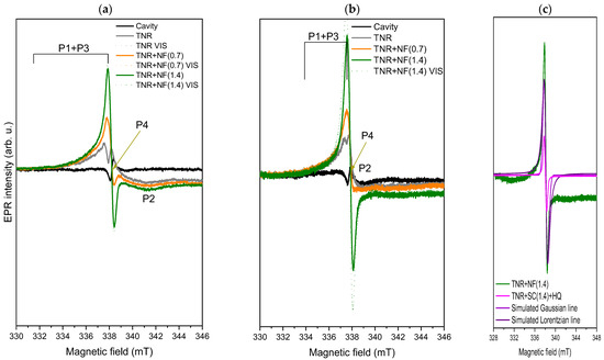 Solid-state EPR spectra of investigated samples under dark and visible-light illumination at (a) room temperature and (b) temperature of liquid nitrogen. (c) contains a simulation of the Lorentzian and Gaussian line shapes in comparison for the simulated impregnation material (TNR + Na-citrate(1.4) + HQ) measured at RT, and for the TNR + NF(1.4) sample examined at the temperature of liquid nitrogen.