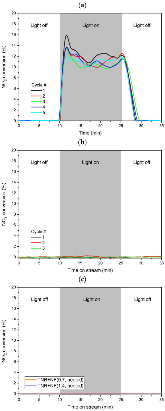 Visible-light assisted NO2 conversion obtained at 30 °C over (a) TNR + NF(0.7), (b) TNR + NF(1.4), (c) TNR + NF(0.7) and TNR + NF(1.4) samples heated at 300 °C.