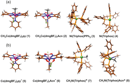 - Sitek, P.; Chmielowska, A.; Jaworska, M.; Lodowski, P.; Szczepańska, M. Theoretical study of cobalt and nickel complexes involved in methyl transfer reactions: Structures, redox potentials and methyl binding energies. Struct. Chem. 2019, 30, 1957–1970. [Google Scholar] [CrossRef]