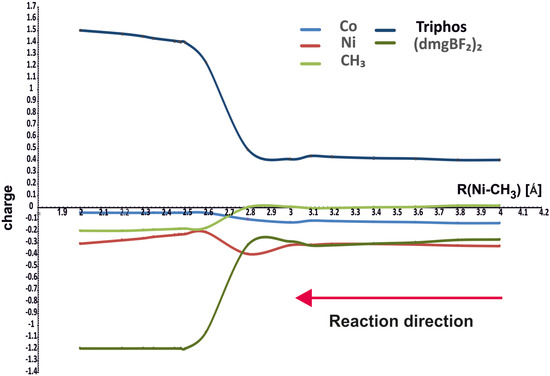 It can be seen that the charges on methyl and cobalt do not change much during the course of the reaction; methyl acquires the charge about −0.2 e after bonding with nickel. The nickel ion shows a substantially negative charge, about −0.8 e, in the starting complex with PPh3, reaching about −0.3 e in the complex with the methyl group. However, the largest changes occur on the (dmgBF2)2 (from small negative to about −1.2 e) and Triphos (from small positive to about 1.2 e) ligands. Hence, the changes in charges do not confirm that methyl is transferred as a positive group, but it retains a generally small charge, even finally negative. The changes involve rather the flow of electron density between coligands through the metal ions.