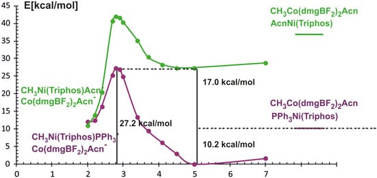 By analogy with the BP86 functional calculations, the energy profile of the considered reaction was determined as a function of the Ni-methyl distance using the PBE gradient functional and the D3BJ dispersion correction. With respect to the reactants occurring in the associate form, the calculated energy profile of the methyl transfer reaction between Co and Ni complexes is shown in Figure 6.