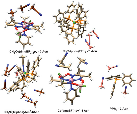 The acetonitrile molecules were added to these parts of structure surfaces, which were engaged in forming associated complexes or intermolecular interactions. In the case of the CH3Ni(Triphos)Acn+ complex, there are two such sites. One is the area around the nickel-bound phosphine ligand, and the other is the area on the side of the methyl ligand. The latter area corresponds to the space between the interacting nickel and cobalt complexes occurring in the form of an associated structure. Thus, in the case of the CH3Ni(Triphos)Acn+ complex, six molecules of solvent were used in the calculation. The calculated solvation energies are gathered in Table 2.