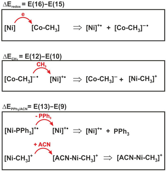 To determine the contribution of individual elementary reactions to the total energetics of reaction (6), the energy effect of the three individual processes included in expression (17) was analyzed. For illustrative purposes, the sense of individual energy differences is shown in Figure 8. Thus, E(16)–E(15) is the difference in redox potentials of the complexes, denoted as . This is the energy effect associated with electron transfer between the nickel and cobalt complexes. The = E(12) − E(10) corresponds to the energy effect of the methyl group transfer, while is the difference E(13)–E(9) between the dissociation energy of the PPh3 group from the reactant and the attachment energy of acetonitrile to the product, i.e., the methylated nickel complex.
