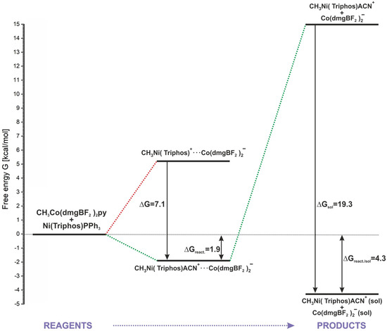 As it was shown in Section 2, the positive energetic balance of the modeled reaction (2) can be obtained by assuming the association of reactants and products and the attachment of the ACN molecule to the methylation product (Table 1, reaction (7)). Only with this approach are both E and G values slightly positive. However, speaking more generally, this result rather indicates the neutral nature of the reaction energetics. An energy diagram representing the energetics of the key stages of the modeled reaction is shown in Figure 9. The starting point is the separated reactants, whose sum of energy is the baseline (0.0 kcal/mol) in relation to the remaining steps. The association of reactants is undoubtedly an advantageous process, allowing the nickel and cobalt complexes to come closer together. Also, the insertion of a solvent molecule into the coordination sphere of the methylated nickel is favorable in respect of product stabilization. As shown in Figure 9, consideration of the coordination of ACN to nickel lowers the energy of the associated products by about 7 kcal/mol. Associated products form a stable macrostructure, and from the point of view of the reaction energetics, the formation of a conglomerate determines the slight reaction endothermicity. The calculated G of the reaction up to this step is 1.9 kcal/mol. The association energy of the MeNi(triphos)Acn+ and Co(dmgBF2)2py− complexes, estimated from calculations, is about 17 kcal/mol. This is a relatively large value, indicating that a complex conglomerate may exist as a structural form of the resulting products in the reaction. However, it should be noted that the reaction takes place in a solvent environment and the action of solvent molecules can lead to the separation of the associates. As shown by the calculation results presented in Section 3.3, the solvation of separated products is an energetically preferable process, giving a significant contribution to the system stabilization. After taking into account the solvation of the products, the estimated free energy of the process sequence from reactants to substrates is 4.3 kcal/mol, as shown in Figure 9.