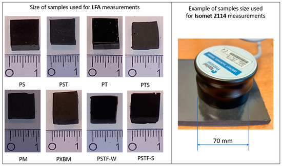 After mixing the components, 280 mL of adhesives-based materials were poured into the molds to obtain samples in the size of 400 mm × 70 mm × 10 mm. The material description (abbreviation, components ratio, features, and density, given by the manufacturer) is collected in Table 1. The collected polyurethane adhesives used in constructing patented technology of Polymer Flexible Joints are covered by patent [18]. The various A:B given in the table is a ratio of the major resin component (such as F&R PS) to the hardener, which allowed us to modify the adhesives’ properties. The visual comparison of the prepared materials for thermal properties investigations by laser flash analysis (LFA) method and Isomet 2114 is presented in Figure 1.