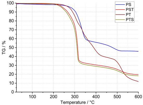 TG curves of PS, PST, PT, and PTS polyurethanes.