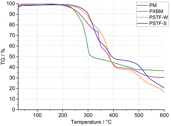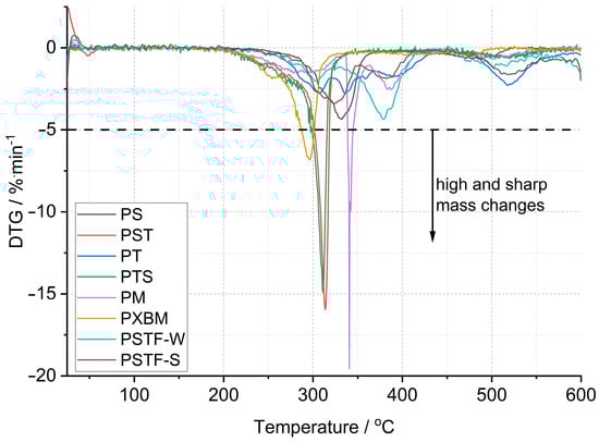 The thermogravimetric curves showed in Figure 2 and Figure 3 that the PT, PSTF-W, and PSTF-S samples decomposed losing 80–88% of their weight. The lowest mass loss is in the case of the PS sample, and it reaches 54%. This data is very important concerning fire events and related gases released. The PST and PTS samples behave almost identically. The data recorded on the thermogravimetric curves showed also that the polymer degradation in elevated temperatures consists of 2–4 steps. That mass loss quantity is an important thing in the case of materials applied in wooden constructions, but the mass change rate is much more significant due to the heat exothermic effect and environment ventilation rate of the released gases.