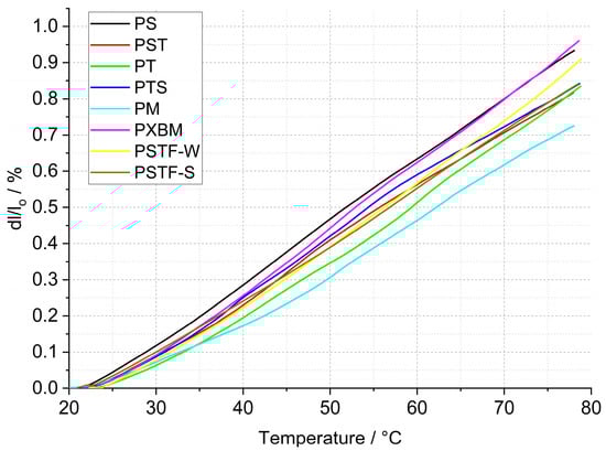 For wooden constructions, thermal expansion of polymers is also very important. This is why all of the FPU- and RPU-based materials were subjected to dilatometric measurements, which were performed on up to 5 samples to obtain an average value. The examinations were made by the DIL 402C dilatometer of Netzsch (Selb, Germany). The measurement was provided on 6 mm diameter samples with the length close to 25 mm. The measurement was made in static conditions with an air heating rate of 1 Cmin−1 up to 80 °C.