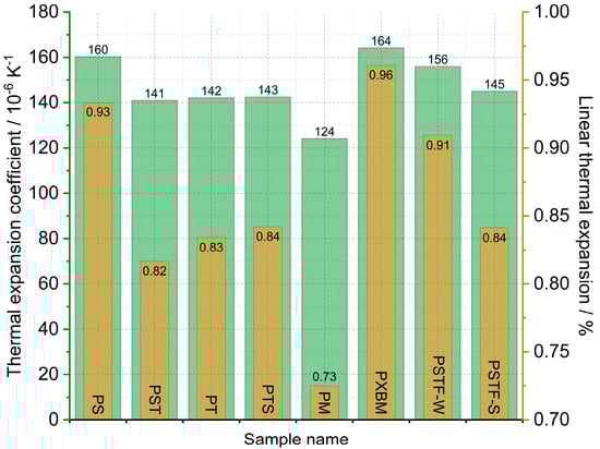 The statistically selected samples of the polyurethanes have been subjected to dilatometric measurement of the linear dimension changes of the adhesives. The calculated linear thermal expansion (TE), based on the recorded data, is shown in Figure 5, and the mean linear thermal expansion coefficient with TE for the 20–80 °C temperature range is presented in Figure 6. The obtained data is planned to be used in future research for the computer simulations of wooden structure joints. The presented data is also used for thermal diffusivity measurement at elevated temperatures to correct the material dimension values.