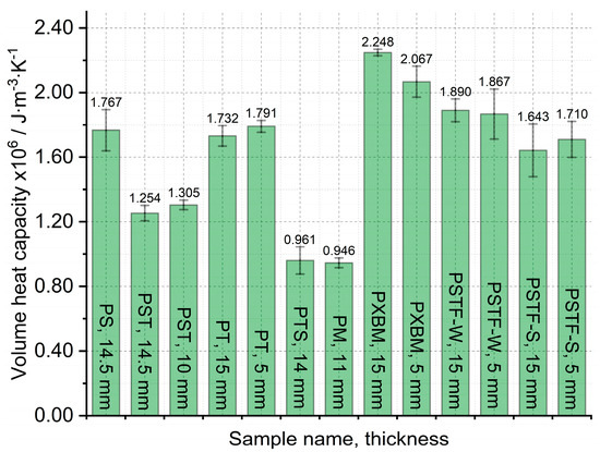 Thermal diffusivity, volume heat capacity, and thermal conductivity were determined by the Isomet 2114 apparatus [19] on the large samples in a size around 400 mm × 70 mm and thickness from 5–15 mm. The samples were measured by type IPS 1100 surface probe and in the 0.04–0.3 W∙m−1∙K−1 measurement range. The accuracy of thermal conductivity measurement was 5%, and measurement reproducibility was 3%. Isomet 2114 allows the investigation of thermomechanical properties in dynamic conditions. During the measurement, the heating element based on the resistor generates heat flow in the sample. This results in the temperature response of the sample. The temperature monitoring of the sample in the function of time allows the calculation of thermal conductivity, thermal diffusivity, and volume heat capacity [19]. The validity of this method was also emphasized in the literature when comparing stationary and non-stationary measurement methods [20]. The device records the heat per unit volume and temperature changes and calculates the volumetric heat capacity Cp. Having material density, it is possible to calculate specific heat capacity (c = Cp/g) [21]. The following equation can calculate thermal diffusivity: