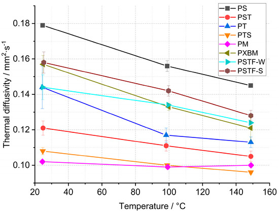 Due to the requirement of the future computer simulation for wooden constructions, the polyurethane adhesives were subjected to thermal diffusivity measurements by the laser flash analysis method. The results gave information on whether the bulk-prepared adhesive material would be uniform on a smaller scale (10 mm × 10 mm × 3 mm). The obtained results are presented in Figure 10. The presented data gave information concerning the behavior of thermal diffusivity in the function of the temperature, which is presented in Figure 11 as a percentage difference between room and 150 °C temperature.