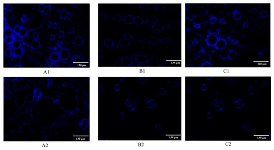 Coumarins usually produce blue fluorescence under ultraviolet light and are easily soluble in methanol, toluene, ether, and other organic solvents [,]. Hence, the sections were fixed with 95% ethanol for 30 min to remove coumarins and then sealed and observed using the DAPI channel of an upright and inverted fluorescence microscope.