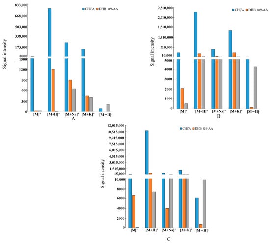 Signal intensity of representative coumarins in different matrices. (A) Nodakenin, (B) imperatorin, (C) oxypeucedanin.