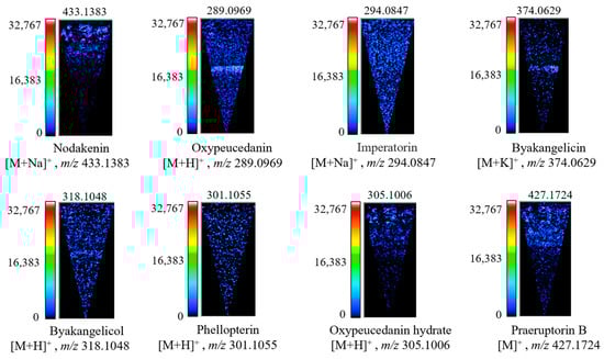 In cross sections of the root of P. decursivum, the pith, xylem, phloem, cortex, and periderm are visible from the inside to the outside []. As shown in Figure 5, coumarins in P. decursivum were mainly distributed in the periderm, cortex, and phloem, which is consistent with the results of previous studies [,,]. Imperatorin ([M + Na]+, m/z 294.0847) and phellopterin ([M + H]+, m/z 301.1055) were evenly distributed in the pith of the stem, xylem, phloem, periderm, and cortex. Oxypeucedanin ([M + H]+, m/z 289.0969), byakangelicin ([M + K]+, m/z 374.0629), and byakangelicol ([M + H]+, m/z 318.1048) were mainly distributed in the phloem, with less distribution in other parts. Nodakenin ([M + Na]+, m/z 433.1383), oxypeucedanin hydrate ([M + H]+, m/z 305.1006), and praeruptorin B ([M]+, m/z 427.1724) were mainly distributed in the cortex and periderm. The distribution of other coumarins is provided in the Supporting Materials (Figure S2).