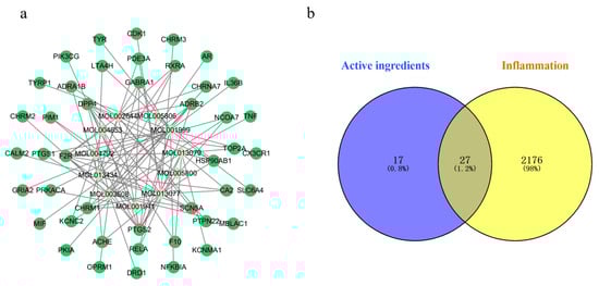 After searching the TCMSP and Swiss Target Prediction databases, 11 ingredients were selected (Table 3) for target prediction, and a total of 44 active ingredient targets were obtained (Figure 6a). The disease targets were searched with “inflammation” as the keyword, and the targets obtained from the databases were merged and deduplicated, obtaining a total of 2203 targets. The active ingredient targets and disease targets were analyzed and represented in a Venn diagram in Venny2.1.0; a total of 27 intersection targets were obtained (Figure 6b), which are potential targets for the anti-inflammatory effect of P. decursivum.