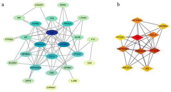 The 27 intersection targets obtained as described in “Section 2.5.1” were imported into the STRING database to analyze protein interactions. After the data were exported, Cytoscape was used to obtain a PPI network diagram, where the higher the interaction score, the darker the color, and the closer the interaction relationship between the examined proteins. As can be seen from Figure 7a, TNF has the darkest color, indicating that TNF is the key target responsible for the plant anti-inflammatory effects. After screening the hub targets using MCC, the top 10 targets were obtained, and the PPI network of the core targets was established (Figure 7b).