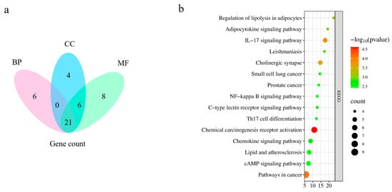 (a) The number of intersecting genes for BPs, CCs, and MFs in GO enrichment analysis, (b) KEGG enrichment analysis.