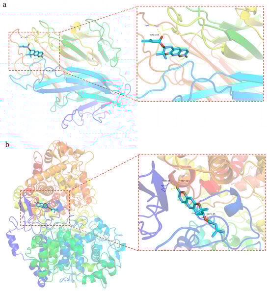 The molecular docking technology combines active ingredients with target proteins to verify the prediction results of network pharmacology in a virtual evaluation manner []. The target protein crystal structures corresponding to the screened key targets were found in the protein structure database RCSB (https://www.rcsb.org/, accessed on 24 June 2023) in pdb format, and the protein crystals were processed using PyMol 2.3.4 software to separate their respective original ligands. The active ingredient, target protein crystal structure, and original ligand were processed using Autodock Tools 1.5.6 software and saved in pdbqt format. Then, the “grid box” of the target protein and the original ligand was found as the active pocket, and verification of the original ligand docking was performed. Autodock Vina 1.5.6 was used to dock the target protein and the active ingredient, and the appropriate conformation was selected. PyMol 2.3.4 software was used for visualization based on the docking results.