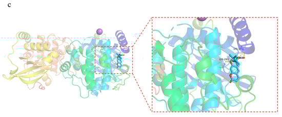Binding conformations. (a) TNF–decursin; (b) PTGS2–decursin; (c) PRKACA–decursin.