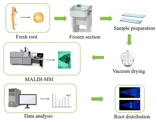- Mi, Y.L.; Sun, W.; Li, M.L.; Zhao, H.Y.; Bian, B.L.; Zhou, Y.Y. Application of MALDI-mass spectrometry imaging in spatial distribution of secondary metabolites in medicinal plants—A case study of Lepdium meyenii root. Chin. J. Chin. Mater. Med. 2022, 45, 596–601. [Google Scholar]