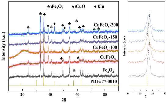 The crystal structure of the catalysts was investigated with XRD and is depicted in Figure 2. The pure Fe2O3 displayed the diffraction peaks at 24.2°, 33.2°, 35.6°, 40.9°, 49.5°, 54.1°, 57.6°, 62.4°, 64.0°, 71.9°, and 75.5°, which corresponded to the crystallized α-Fe2O3 for (012), (104), (110), (113), (024), (116), (122), (214), (300), (101), and (220), respectively. The diffraction peaks of pure Fe2O3 presented with high crystallinity. As for the CuFeOx catalyst, new peaks attributed to CuO at 38.8°, 48.6°, and 61.6° appeared. In addition, the peak intensity of Fe2O3 decreased significantly compared with pure Fe2O3, indicating the formation of a strong interaction between Fe and Cu species, as a result of the smaller particle size and reduced crystallinity. For CuFeOx-100 and CuFeOx-150 catalysts, the peaks at 48.6° and 61.6° weakened and even disappeared, possibly attributable to the reduction of CuO to Cu2O and/or metallic Cu. The peaks assigned to metallic copper at 43.4° and 50.5° could be found on the CuFeOx-200 catalyst, which confirmed that part of the CuO species was reduced to metallic Cu species due to the H2 activation. Interestingly, the peaks of Fe2O3 at 35.7° on the H2-activated catalysts shifted to a lower 2θ degree compared to the CuFeOx catalyst. This demonstrated that the H2 activation promoted the formation of Fe2+ species and resulted in the lattice expansion, which suggested that the Fe2O3 also participated in the reduction process. In addition, no obvious diffraction peaks related to the CuFeOx phase were found.