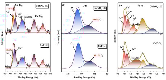 The effect of H2 activation on surface chemical composition on the catalysts was determined with XPS, as depicted in Figure 3. In addition, the atomic percentages of elements were calculated from the areas of the fitted peaks and were presented in Table 2. The Cu 2p of catalysts are depicted in Figure 3a, which could be separated into Cu 2p1/2 and Cu 2p3/2, respectively [24]. The two peaks of Cu 2p3/2 located at 933.4 and 934.8 eV corresponded to Cu+ and Cu2+ species, respectively [1,25]. In addition, the shake-up satellite peak at 942.3 eV was assigned to CuO. According to previous studies [9,26,27], the Cu+ species was the main adsorption and activation sites of CO, playing a crucial role in the CO oxidation process. It could be noted that the proportion of the CuFeOx catalyst was 10.2%, which was much lower than that of 17.5% on the CuFeOx-100 catalyst. This confirmed that the H2 activation could promote the generation of Cu+ species, thus increasing the CO conversion.