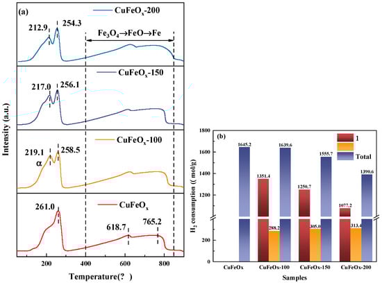 The H2-TPR was performed to measure the reducibility of catalysts and is shown in Figure 4a. As for the CuFeOx catalyst, the strong peak at 261.0 °C could be assigned to the coreduction of CuO to metallic Cu and Fe2O3 to Fe3O4, while the broad peaks in the range of 400 to 800 °C belonged to the sequential reduction of Fe3O4 to FeO and then to Fe. Compared to the pure Fe2O3 catalyst [12], the reduction temperature of Fe2O3 to Fe3O4 decreased to below 300 °C, indicating that the synergistic effect between Cu and Fe species significantly improved the redox capacity. That is, the Cu species as the active sites facilitated the overflow of H2 to Fe2O3, thus accelerating the reduction to Fe3O4 at low temperature. Additionally, a shoulder peak appeared on the H2-activated catalyst at lower temperature, which may be ascribed to the reduction of CuO or/and Cu2O to metallic Cu. This further confirmed that the H2 activation promoted the generation of more Cu2O. Moreover, the initial reduction temperature on the CuFeOx catalyst was 120 °C, while it shifted to 98 °C on the CuFeOx-100 catalyst. The improvement in initial redox property could effectively increase the catalytic activity at low temperature. The Fe species reduced at 400–800 °C had almost no catalytic activity, and activity tests were performed at low temperatures, so it was not involved in the reaction processes. The H2 consumption corresponding to the reduction peak below 400 °C was determined based on its integrated area, as depicted in Figure 4b. The total H2 consumption on the CuFeOx catalyst slightly decreased from 1645.2 μmol/g to 1639.6 and 1555.7 μmol/g on the CuFeOx-100 and CuFeOx-150 catalysts, respectively, while it significantly decreased to 1390.6 μmol/g on the CuFeOx-200 catalyst. The H2 activation at high temperature resulted in part of the active metal oxides being reduced to a metallic state, which may be the main reason for the decline in CO conversion of the CuFeOx-200 catalyst.