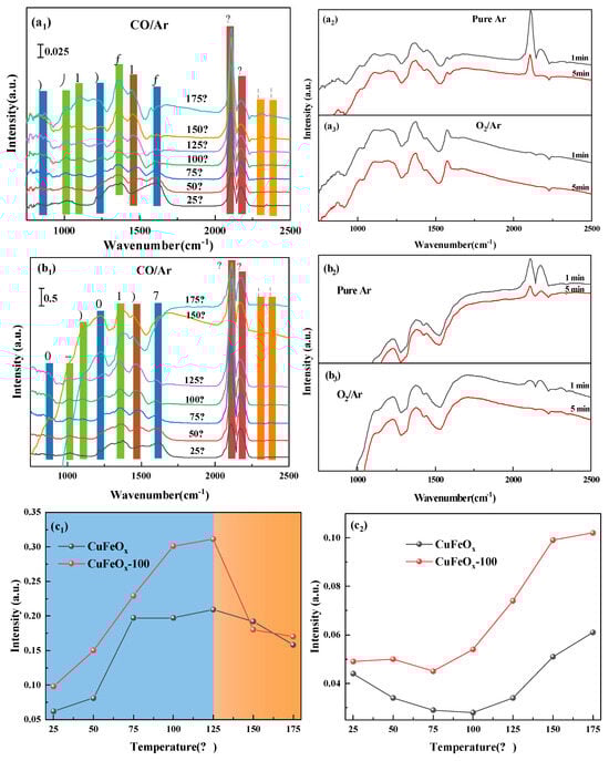 In situ DRFITS spectra of CO adsorption, pure Ar purging, and pure O2 purging: CuFeOx (a1–a3) and CuFeOx−100 (b1–b3) catalysts. Behavior of Cu+−CO species at 2110 cm−1 (c1) and carbonate species at 1361 cm−1 (c2).( ♣ bicarbonate species, ♦ carbonate species, ♥ monodentate carbonates, ▲ Cu+-CO species, ■ CO2).