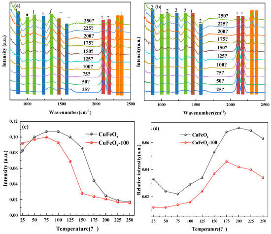 The in situ DRFITS of CO+O2 coadsorption is displayed in Figure 7. As depicted in Figure 7a,b, the species and variation trend of intensity with temperature was similar in CO atmosphere both for CuFeOx and CuFeOx-100 catalysts. As illustrated in Figure 7c, the intensity of the Cu+-CO species on the CuFeOx and CuFeOx-100 catalysts was decreased to 100 and 75 °C compared with CO atmosphere, respectively, which proved that the O2-riched atmosphere was conducive to the CO oxidation. In addition, the Cu+-CO species on the CuFeOx-100 catalyst was stronger than the CuFeOx catalyst at 25 °C and lower at higher temperature, which further confirms that the Cu+-CO species with H2 activation was more active. As displayed in Figure 7d, the carbonate species both on CuFeOx and CuFeOx-100 catalysts was lower than in CO atmosphere, which implies that the presence of O2 can promote the decomposition of carbonate species. In contrast to the CO atmosphere (Figure 6(c2)), the strength of carbonate species on the CuFeOx-100 catalyst was higher than that on the CuFeOx catalyst (Figure 7d), indicating that carbonate species were more easily decomposed on the CuFeOx-100 catalyst in reaction to atmosphere. Interestingly, it was found that the intensity of the carbonate species started to decrease and was accompanied by the generation of CO2 sharply after 175 °C, which suggests that the CO oxidation process was conducted through the L-H mechanism.