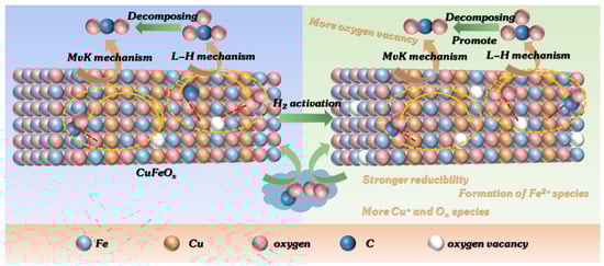 CO oxidation on the CuFeOx catalyst at high temperatures (>175 °C) proceeded via both the MvK and the L-H mechanism, with the latter described in Equations (4)–(6). The gas O2 was captured by oxygen vacancy and formed chemisorbed oxygen species, as shown in Equation (4). The H2 soft pretreatment increased the concentration of oxygen vacancy on the CuFeOx catalyst, which promoted the process of Equation (4). Then, the chemisorbed oxygen species reacted with Cu+-CO species (Equation (1)) to generate carbonate species, as exhibited in Equation (5). The carbonate species decomposed into CO2, as described in Equation (6). The H2 activation accelerated the decomposition of carbonate species, which alleviated the accumulation of carbonate occupying the active sites and improved the efficiency of CO oxidation. Based on the above, a possible reaction model is proposed and is illustrated in Scheme 1.