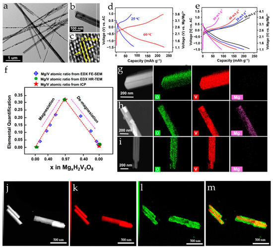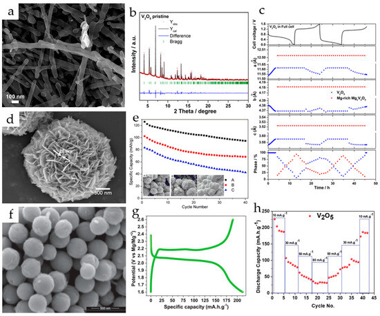 Hydrothermally synthesized V2O5 nanowires (Figure 2a) were used as a cathode in a magnesium ion system with 1 M Mg(ClO4)2/AN as an electrolyte and MgxMo6S8 (x ≈ 2) as an anode [75]. V2O5 nanowires provided an initial discharge/charge capacity of 103/110 mAh·g−1 and a maximum discharge capacity of 130 mAh·g−1 in the sixth cycle at a C/20 rate in a full cell.